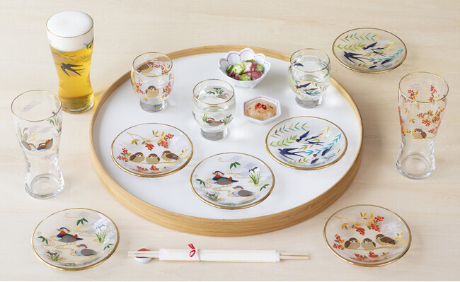日本の四季折々の風景を彩る鳥をモチーフに美しい草花と吉祥文様を組み合わせ、「雀と南天」「鴛鴦(おしどり)と菖蒲」「燕と柳」の3柄をデザインしました。口部や皿の縁に一つひとつ手作業で施された金巻きが華やかなグラスウェアは、金色の箔押し仕様の高級感のあるパッケージで大切な方への贈り物や、豊かなひとときを過ごすのにぴったりです。
