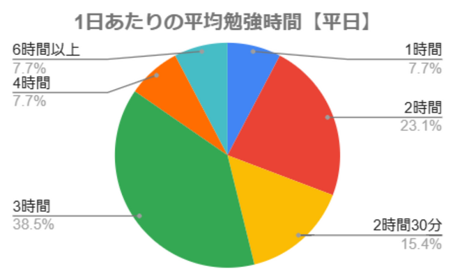 勉強時間で最も多かった回答は、平日が3時間の38.5%、休日は6時間以上の38.5%、次いで3時間の30.8%でした。