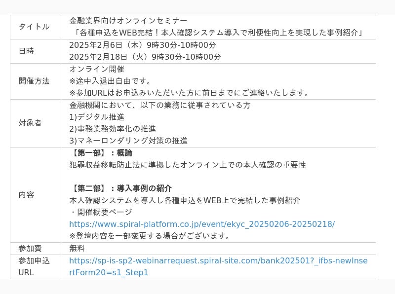 デジタルで未来最適をリードするスパイラル株式会社(東京都港区、代表取締役 CEO 佐谷 宣昭)は、金融機関向けオンラインセミナー「各種申込をWEB完結!本人確認システム導入で利便性向上を実現した事例紹介」を2025年2月6日(木)、18日(火)に開催いたします。