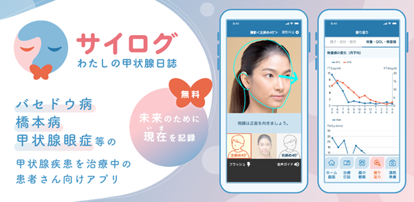 甲状腺疾患は、眼球突出、甲状腺の腫れ、体重の増減など、さまざまな症状が現れる病気です。特に眼球の突出は、緩やかに進行する場合があり、患者さんは変化に気づきにくく、医師に正確に病状を伝えることが難しいという課題がありました。「サイログ」は、顔貌の写真を定期的に記録し変化を比較することで、患者さんが医師に症状の進行を伝えやすくする仕組みを提供します。