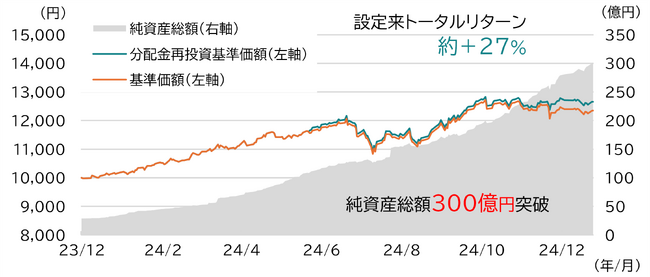 その結果、当ファンドは2025年1月21日時点で分配金お支払い後の基準価額12,344円、純資産総額301億円と好調なパフォーマンスを見せています。(分配金設定来合計300円お支払い)