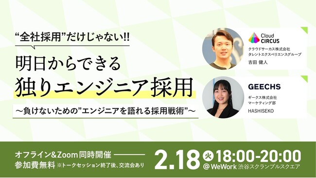 ギークス株式会社(本社:東京都渋谷区、代表取締役CEO:曽根原 稔人、以下ギークス)は、2025年2月18日(火)18:00~20:00にて、クラウドサーカス株式会社(本社:東京都新宿区、代表取締役CEO:北村 健一:以下クラウドサーカス)と共催でエンジニア採用担当者向けの無料セミナー「全社採用だけじゃない!明日からできる独りエンジニア採用~負けないための“エンジニアを語れる採用戦術”~」を開催します。