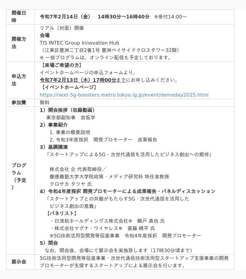 この度、これまでの成果発信及びこれからの次世代通信技術の活用に向けた機運醸成として、「Tokyo 5G Boosters Project/Tokyo NEXT 5G Boosters Project DEMODAY 2025」を開催いたします。