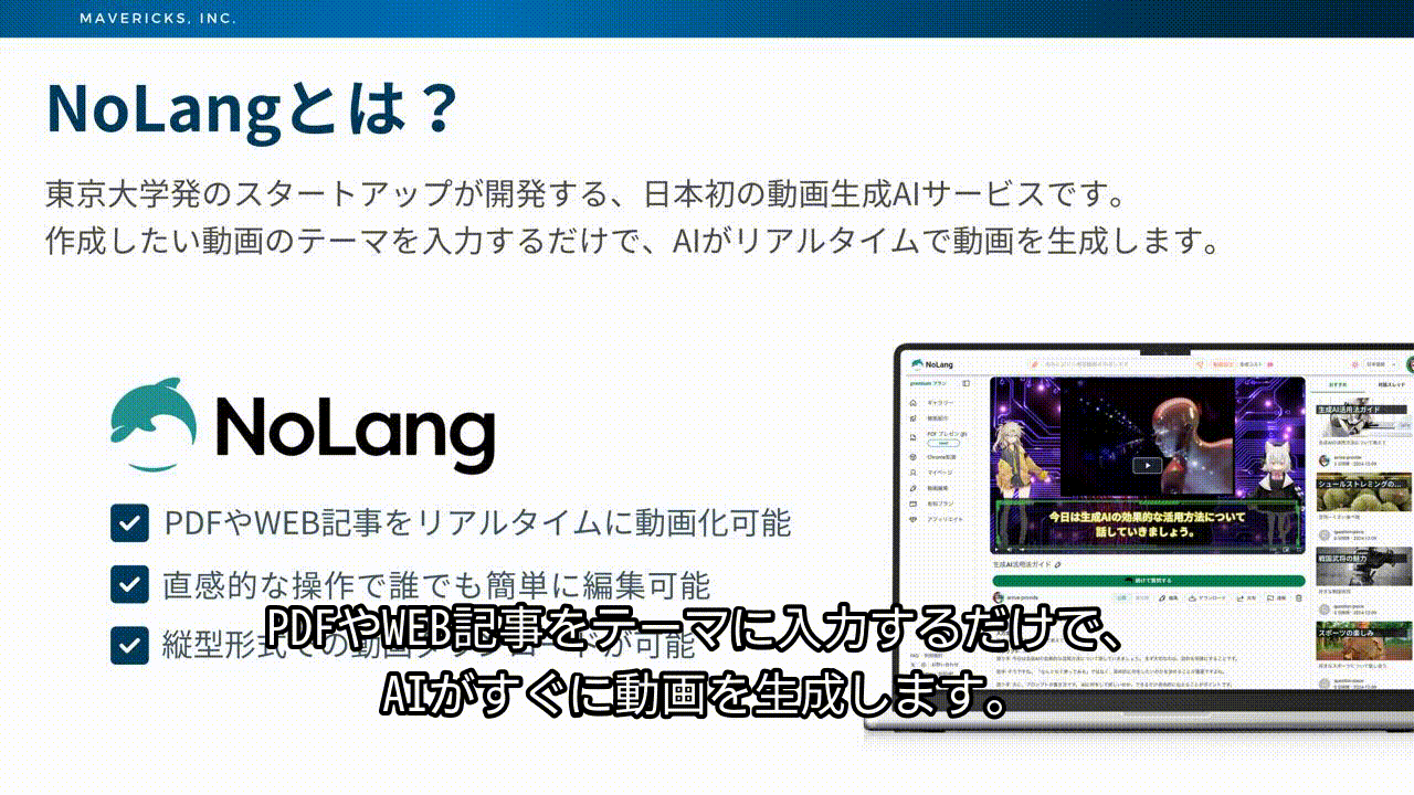 株式会社Mavericks(東京都港区,代表取締役:奥野将太)は、動画生成AIサービス「NoLang」の法人向けプラン「NoLang for Business」の提供を開始いたしました。