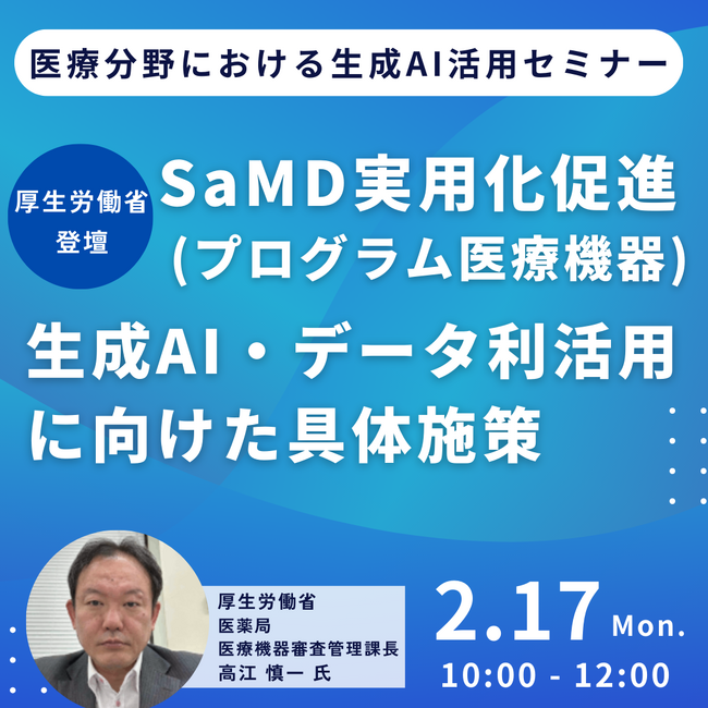 【JPIセミナー】厚生労働省「SaMD実用化促進(プログラム医療機器)、生成AI・データ利活用に向けた具体施策と今後の政策の方向性」2月17日(月)開催