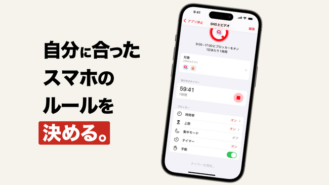 ・ 例:「仕事中の9時から17時は動画アプリを制限」など。