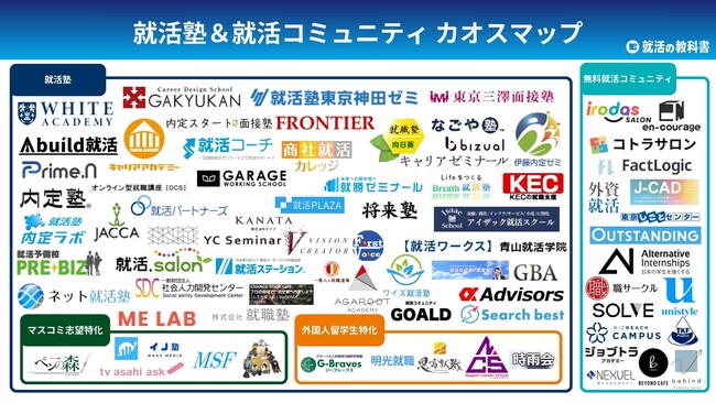 私たち「就活の教科書」は、就職活動に取り組む学生の役に立てればと思い、就活塾/就活コミュニティのカオスマップを作成いたしました。