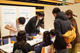 体験ブースでは、「環境にやさしい素材を用いた製作体験」をテーマに、3Dプリンターを使用して生じたプラスチック破片のリサイクルをねらいとして、破片を粉砕、圧縮形成を行い、メダルなどの製作体験を行いました。また、展示ブースでは研究室で製作したコーヒーカップホルダーやプランターなどの製作物や、松本研究室が取り組んでいる研究について紹介・展示しました。