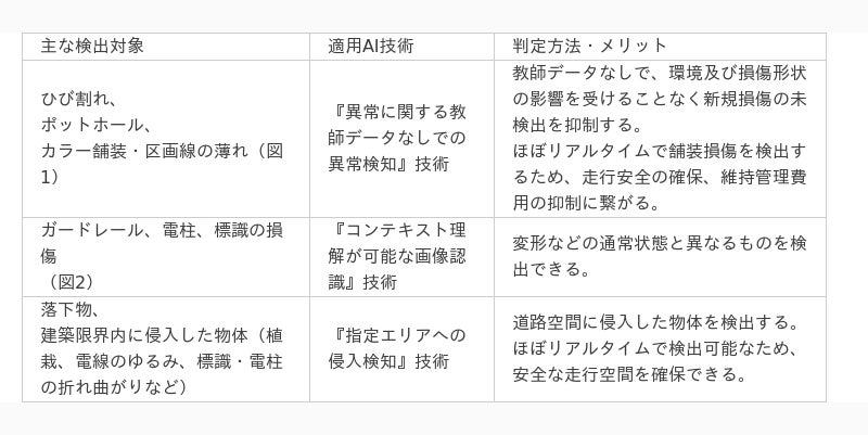 表:本システムにおける主な検出対象と適用AI技術、判定方法・メリット