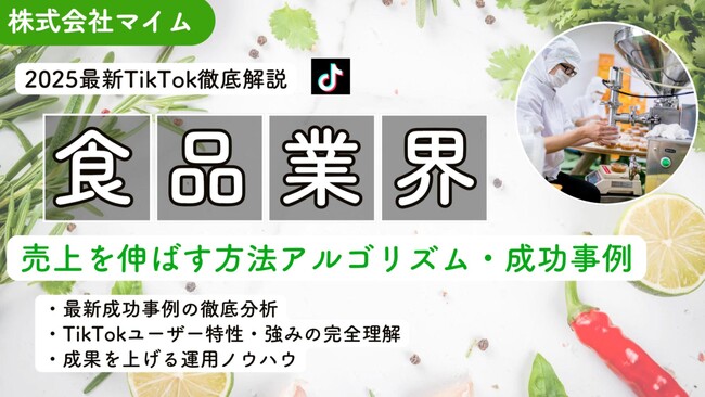 株式会社マイム(本社:東京都品川区、代表取締役社長:古川 湧一、以下「当社」)は、食品業界の皆様を対象に「2025年版TikTokトレンドレポート」を公開いたしました。本レポートは、TikTokを活用した最先端のプロモーション事例や成功パターン、そして結果に直結する戦略的な運用ノウハウを一冊に集約。