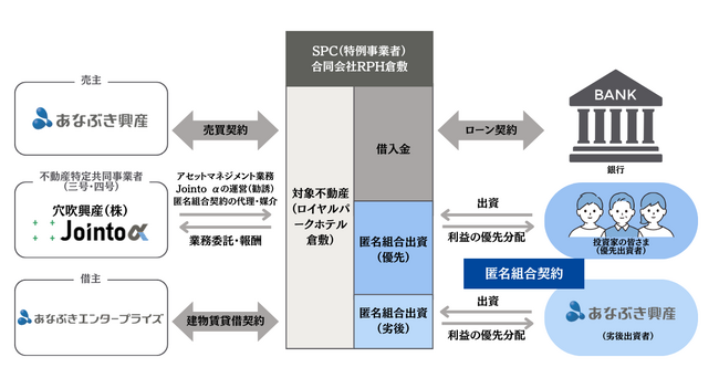 SPC型アルファアセットファンド1号は、岡山県倉敷市の「ロイヤルパークホテル倉敷」が投資対象です。本物件を特例事業者であるSPCが取得し、運営会社のあなぶきエンタープライズへ賃貸し、賃料収入と売却時の利益を配当原資として投資家の皆様に分配します。