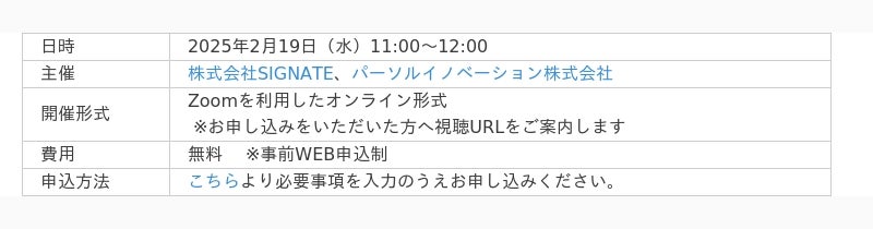 企業のDX推進を支援する株式会社SIGNATE(本社:東京都港区、代表取締役社長:齊藤 秀、以下「SIGNATE」)は、パーソルイノベーション株式会社 Reskilling Camp Company(本社:東京都港区、代表:柿内 秀賢)と、2025年2月19日(水)に「成功事例に学ぶ変革の手法」をテーマとしたウェビナーを共同開催します。