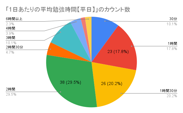 勉強時間で最も多かった回答は、平日が2時間の29.5%、休日は3時間の20.2%でした。