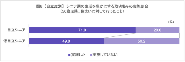 50歳以降、シニア期の生活を豊かなものにするために住まいに対して取り組みを実施した自立シニアは71.0%にのぼりました。一方で、低自立シニアでは49.8%にとどまりました。