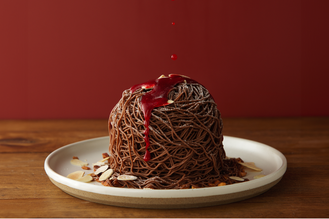 別添えのフランボワーズソースをかけることで、濃厚なマロンクリームと甘酸っぱいフランボワーズのハーモニーが生まれ、味わいの変化をお楽しみいただけます。さらに、トッピングのアーモンドが食感のアクセントを加え、最後まで飽きのこない仕上がりとなっております。