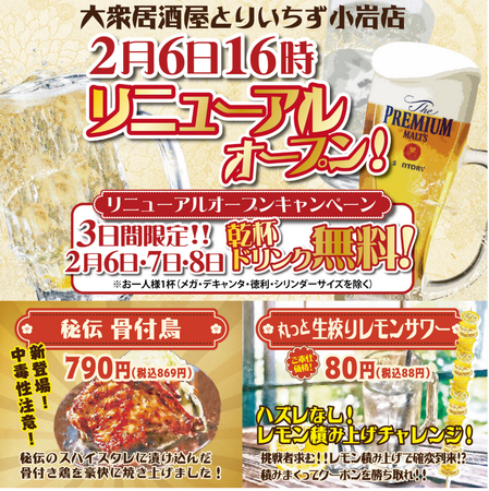 とりいちず小岩北口店がリニューアルオープン!掘りごたつ席新設&乾杯ドリンク無料キャンペーン開催
