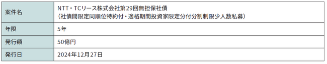 ソニー銀行株式会社(代表取締役社長:南 啓二/本社:東京都千代田区/以下 ソニー銀行)は、このたび、NTT・TCリース株式会社(以下 NTT・TCリース)が発行するグリーンボンド(以下 本債券)への投資を実施しましたのでお知らせします。