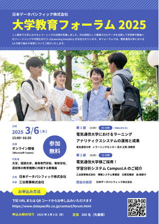 教育システム・ソフトウェアの開発で、「教育の質の向上」を目指す日本データパシフィック株式会社(本社:東京都国立市、代表取締役:平 治彦)は、ラーニングアナリティクスシステムについて、電気通信大学の事例をご紹介する「大学教育フォーラム2025」を開催いたします。