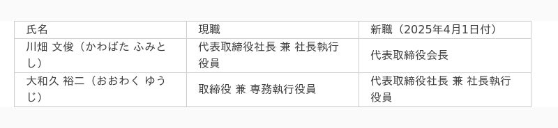 当社は、2025年4月1日付で、下記の通り代表取締役の異動を行いますのでお知らせいたします。