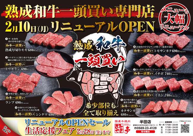 あみやき亭半田店2月10日リニューアルオープン!!半田店限定で和牛一頭買い商品全て取り揃え!武豊店と合同で【生活応援フェア】も同時開催!