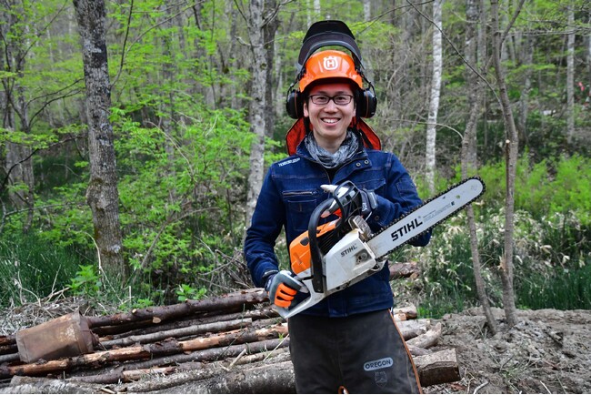 自伐型林業推進の1期生となった1年目は山林の確保と知識の習得に費やし、1年目の最後には山林を運営するまでに至ったそうです。そして迎えた2年目、将来のビジネスを見据え、様々な事業を試して収益性や再現性の検証・選別などを進め、現在は30haの山林を確保するまでに至っています。任期終了後の今でも、同じく池田町の地域おこし協力隊員だった頓所 幹成(とんどころ みきなり)さんと設立した「minotake(みのたけ)」で、隊員だった頃と変わることなく、自伐型林業を広めていくための活動を行っています。また2024年4月には池田町内に民泊施設「yadorigi(やどりぎ)」を開業。自分で伐採した木材を使ったまきストーブを備え「池田町への移住のステップになるように」と協力隊卒業生として移住もサポートしています。