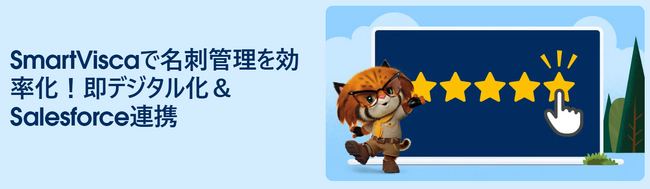 Salesforce活用における最も重要なポイントのひとつが「正確な顧客情報の登録・更新・活用」です。この課題を解決するためにお客様の声に応える形で生まれたSmartViscaは、AI-OCR機能による名刺の取り込みに加え、オンラインプロフィール交換の機能を統合し、ひとつのアプリケーションで、オフラインとオンラインの両方で獲得した顧客情報をSalesforceに迅速に登録・更新・共有することが可能になります。この機会にぜひ高評価カスタマーレビューをご覧ください。