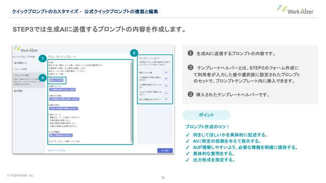 吉積情報株式会社(本社:東京都千代田区、代表取締役社長:秋田晴通、以下、吉積情報)は、法人向け生成AIツール「WorkAIzer(ワークアイザー)」において、チームでの生成AIの活用を促進する新機能「カスタムクイックプロンプト」をリリースしたことを発表いたします。