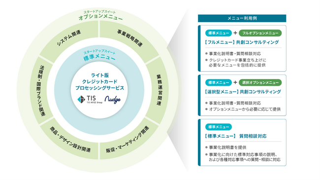 そこで今回、TISとナッジでは、クレジットカードの事業化に向けたコンサルティングサービスのほか、事業戦略・マーケティング、法規制対応、クレジット業務関連、顧客対応等のオプションメニューを、専門スキルを持つ各社とのアライアンスのもと取り揃え、クレジットカード事業に必要な幅広い要素を共創支援するスタートアップスイートの提供を開始します。