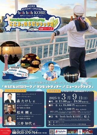 クルーズの第一部では、臨床心理学の専門家である「松本 剛」氏と「三井 知代」氏をお呼びし日頃の緊張をほぐし、こころとからだを労わる簡単な心理ワークを体験していただけます。その他にも神戸シーバスが実地している「タラソセラピー体験」や「からだにやさしい神戸食」、森たけし氏率いるミュージックバンドによる「ミュージックライブ」など、こころとからだをゆるめ活力を満たす多くのコンテンツをご用意。日常から離れ船上で過ごすboh boh KOBEでしか体験のできない癒しのウェルネスクルーズにぜひご参加ください。