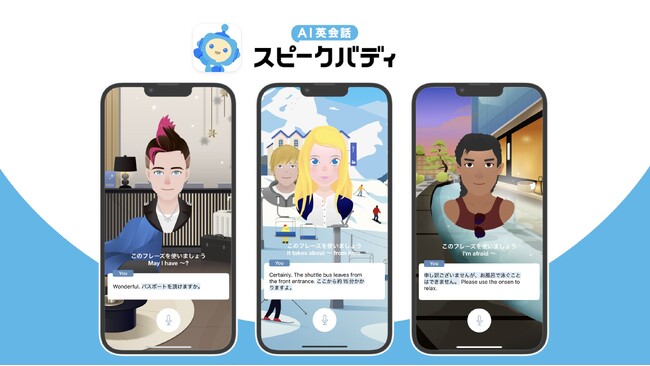 「スピークバディ」は、2016年9月にリリースした日本発のAI英会話アプリ。第二言語習得理論と最新鋭のAI技術(音声認識や生成AI・自然言語処理など)を融合させることで、講師予約や教室への移動を伴うことなく1日15分~の学習で効率的に英会話力を習得します。また1,000以上のシーンで構成されたオリジナルストーリーに基づくレッスンでは、学習者が主人公となり、個性豊かなキャラクター(AIバディ)との会話を通してキーフレーズや発音、語彙、イディオムを総合的に学ぶことができます。