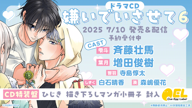株式会社リブレ(本社:東京都新宿区、代表取締役社長:是枝由美子)は、ドラマCD「嫌いでいさせて6」を2025年7月10日に発売致します。https://www.b-boy.jp/special/kiraide-isasete/cd/