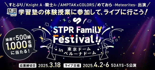 「勉強を頑張る子どもたちを応援したい!」そんな気持ちから、今回のキャンペーンをスタートしました。10代を中心に幅広い年代に人気を誇る「すとぷり」「Knight A - 騎士A -」「AMPTAKxCOLORS」「めておら - Meteorites -」といったSTPR所属2.5次元アイドルグループがドームに集結する「STPR Family Festival!!」とのコラボレーション。キャンペーンにご応募いただいた方の中から抽選で500組1,000名様を東京ドームとベルーナドームで開催される「STPR Family Festival!!」にご招待します。