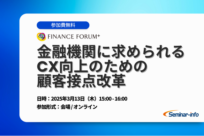 株式会社セミナーインフォ(本社:東京都千代田区 代表:小西 亘)は、2025年3月13日(木)にFINANCE FORUM⁺「金融機関に求められるCX向上のための顧客接点改革」を開催いたします。