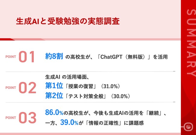 - 03|86.0%の高校生が、今後も生成AIの活用を「継続」、一方、39.0%が「情報の正確性」に課題感