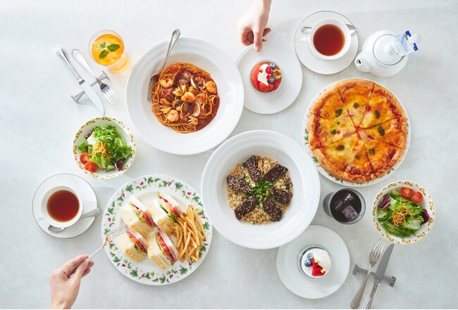 ミニサラダ、ドリアやスパゲティなどのお食事メニュー、パティシエ特製のケーキ、ドリンクが付いた、通常約5,000円相当の充実の内容で、3時間ごゆっくりとお過ごしいただけます。ドリンクは、コーヒーに加え、ドイツの老舗紅茶ブランド「ロンエフェルト社」の紅茶・緑茶を13種類取り揃え、種類を替えて何度でもおかわりを承ります。