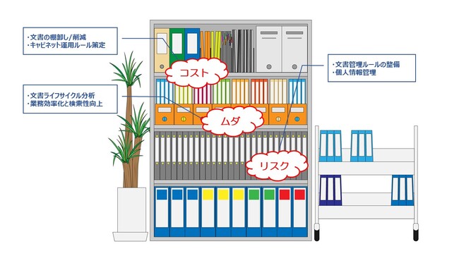 本サービスは、現状調査のうえでお客さまと共に課題設定を行い、キャビネット内の不要な書類を判別し整理することで、書類の削減を支援します。また、文書管理方法の見直しなど運用ルールの策定を支援することで、継続的に発生する書類の増加を抑制します。業界初の、サービスメニュー明確化と料金を固定化したパッケージプラン(50万円、税抜)※にすることで、お客様の利便性の向上を図ります。