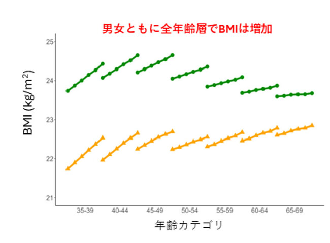 【慶應義塾】働く中高年世代(35歳~69歳)の全年齢でBMIが増加傾向に