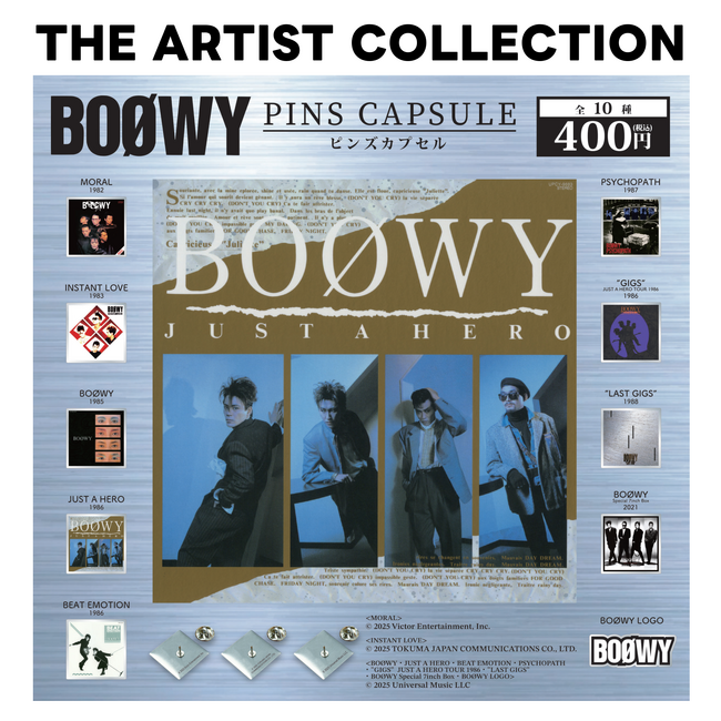 海外アーティストのアルバムジャケットやロゴをデザインしたピンズカプセルトイシリーズ『THE ARTIST COLLECTION』第7弾「BOØWY」の発売が決定!