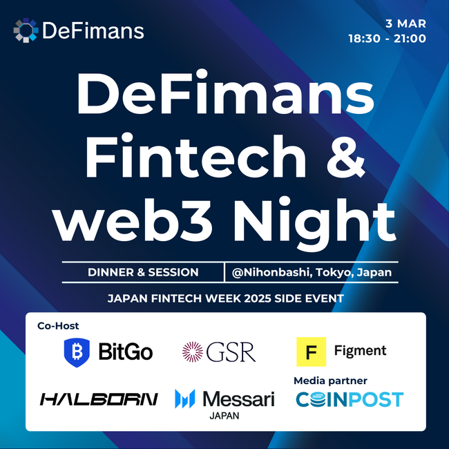 株式会社DeFimans(本社:東京都港区、代表取締役:小野 暢思・佐藤 太思、以下「当社」)は、2025年3月3日(月)~7日(金)に開催される「Japan Fintech Week 2025」のサイドイベントとして、『DeFimans Fintech & web3 Night』を開催いたします。当社が国内外で構築してきた強固な連携を基に、グローバルなweb3業界をリードする5社との共催が実現いたしました。web3業界の第一人者が一堂に会する貴重な機会となりますので、ぜひご参加ください。