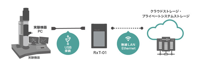 RxT-01は、これまで研究者を悩ませてきた「実験機器からのデータ転送」という課題を一気に解決するIoTデバイスです。非ネットワーク環境下の実験機器に本デバイスを接続するだけで、研究データ基盤などのクラウドへの高速かつ安全なデータ転送を実現します。DVD・USBメモリでの手動転送や、PCを介したアップロード作業が不要となり、研究者の作業効率を大幅に向上させます。