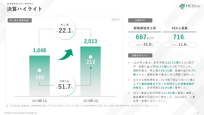 株式会社ヒューマンクリエイションホールディングス(本社:東京都千代田区、代表取締役社長 富永 邦昭、以下「当社」といいます。)は、2025年2月10日、2025年9月期 第1四半期決算を発表致しました。 売上高は、前年同期比22.1%増の2,013百万円、営業利益は同51.7%増の212百万円。通期計画は売上高が20.1%増、営業利益が0.7%増のため、通期計画の達成に向け順調に推移しました。