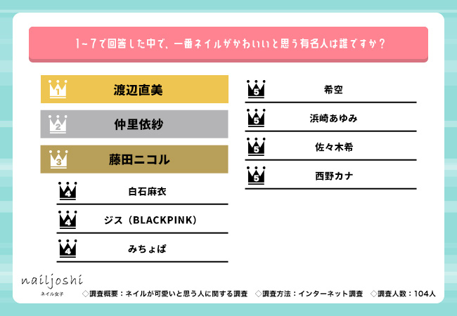 それでは、各ジャンルでネイルがかわいい人のアンケート結果について見ていきましょう。