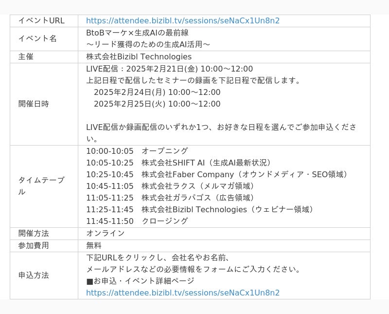 株式会社ラクス(本社:東京都渋谷区、代表取締役:中村 崇則)が提供するメールマーケティングサービス「配配メール」は、2/21(金) に株式会社Bizibl Technologies(本社:東京都千代田区、代表取締役:花谷 燿平)主催のオンラインイベント「BtoBマーケ×生成AIの最前線~リード獲得のための生成AI活用~」に登壇いたします。