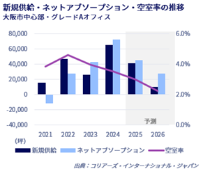 2024年10~12月期の大阪市中心部のグレードAオフィスマーケットでは、大阪駅周辺の一連の再開発ビルの中で最大規模となるグラングリーン大阪ゲートタワーおよびパークタワーが竣工を迎え、34,000坪の大規模供給を記録しました。このような大規模供給に対してネットアブソープション※2は供給量と同等の水準に達し、空室率は横ばいを維持しました。
