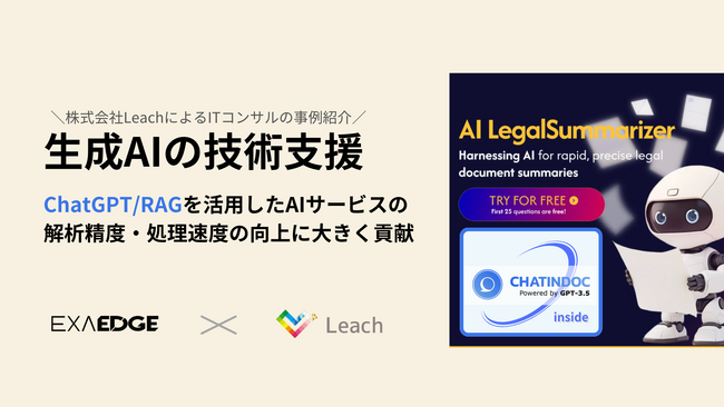 Leachは、RAG(Retrieval-Augmented Generation)の概念が一般化する以前から、検索と生成を組み合わせた技術の研究を進めており、この知見を活かし、エクサエッジのAI技術の最適化を支援しました。また、ChatGPTリリースの2ヶ月後に開発・リリースした「ChatInDoc」では、高精度な要約技術の実装や解析モデルの最適化を行い、そこで培った技術を本プロジェクトに応用しました。