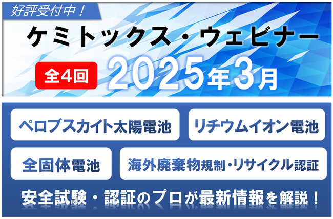 【安全試験のプロが解説!ケミトックス・ウェビナー】ペロブスカイト太陽電池、全固体電池、リチウムイオン電池、海外リサイクル認証の最新情報&基礎知識を解説します!【3月5日、12日、19日、26日】