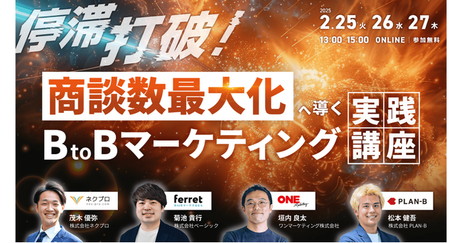 BtoBマーケティングのお困りごとをまるっと解決するサービス『ferret(フェレット)』を運営する株式会社ベーシック(本社:東京都千代田区、代表取締役:秋山勝)は2/25(火)13時より、株式会社ネクプロ(本社:東京都千代田区、代表取締役:尾花慎也)が主催するセミナー「停滞打破!商談数最大化へ導く BtoBマーケティング実践講座」に登壇いたします。