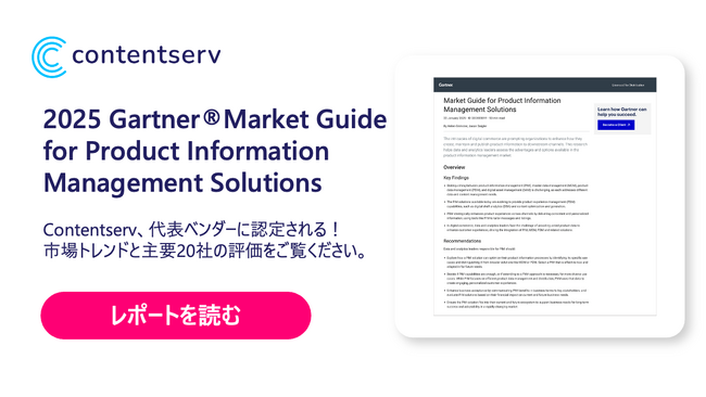 商品情報管理(PIM)およびプロダクトエクスペリエンス管理(PXM)分野のクラウドプロバイダーであるContentservは、 最新のGartner Market Guide for PIM 2025 において、「全PXM機能を提供する数少ないベンダー」の一社として認定されました。(https://www.contentserv.com/ja/reports-and-surveys/gartner-market-guide-product-information-management-solutions-2025)