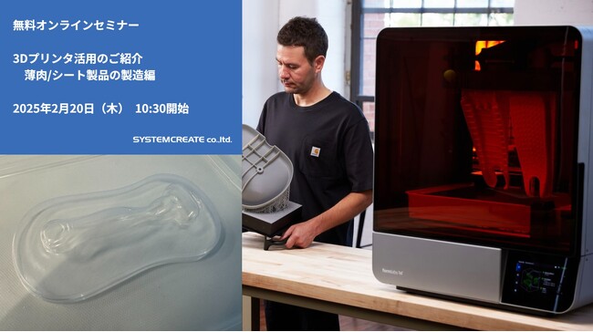 株式会社システムクリエイト(本社:大阪府東大阪市荒本新町、代表:川上正義)は、2025年2月20日(木)10:30に、無料オンラインセミナー「3Dプリンタ活用のご紹介 薄肉/シート製品の製造編」を開催いたします。