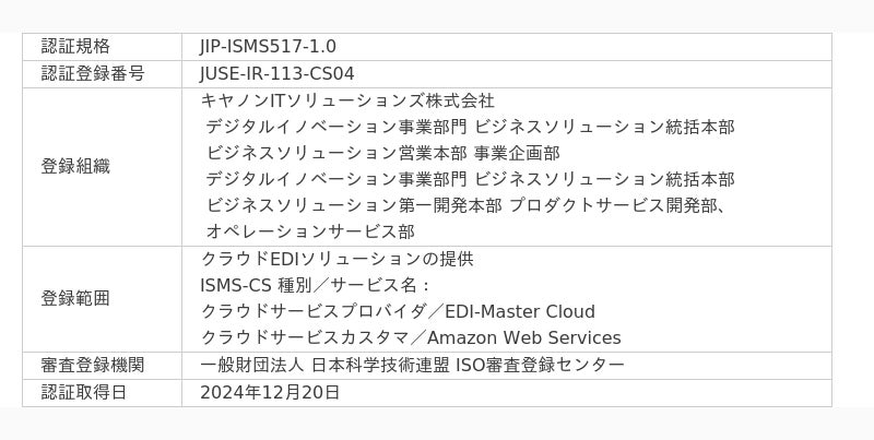 キヤノンマーケティングジャパングループのキヤノンITソリューションズ株式会社(本社:東京都港区、代表取締役社長:金澤 明、以下キヤノンITS)は、2024年12月20日付で、クラウドEDIサービス「EDI-Master Cloud」において、クラウドサービスに関する情報セキュリティの国際規格である「ISO/IEC 27017」認証を取得しました。情報セキュリティ管理体制のさらなる強化により、安心、安全なクラウドEDIサービスを提供します。